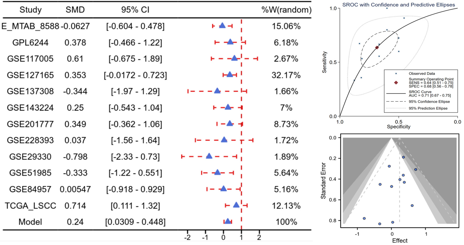 To assess E2F5 protein expression differences in LSCC, the Wilcoxon rank-sum test was used, with P < 0.05 as the significance criterion. A fixed-effects model calculated SMD when heterogeneity was low (I2 < 50%); otherwise, a random-effects model was applied. The “pROC” package plotted ROC curves, and STATA 18.0 generated sROC curves. AUC measured E2F5 expression levels, with larger AUC indicating higher expression. The Begg test evaluated publication bias, with P > 0.05 indicating no bias.
