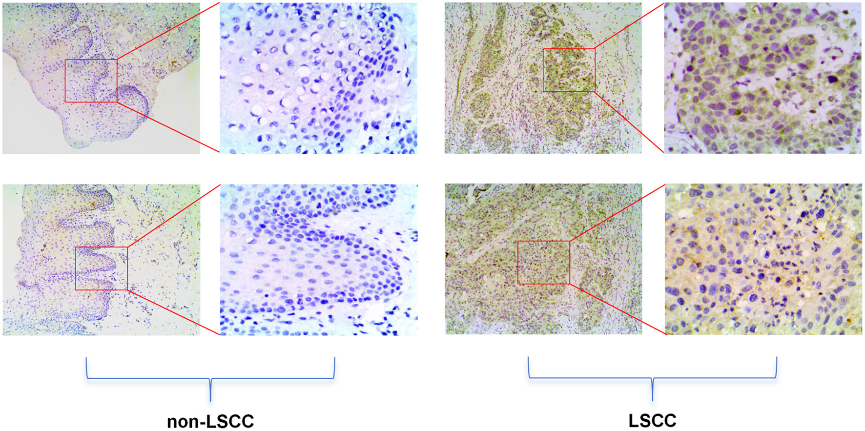 ![]() Click for large image | Figure 4. High E2F5 expression in LSCC tissues at the protein level. The top panel shows immunohistochemical staining of non-LSCC tissues, and the bottom panel shows immunohistochemical staining of LSCC tissues. LSCC: laryngeal squamous cell carcinoma. |