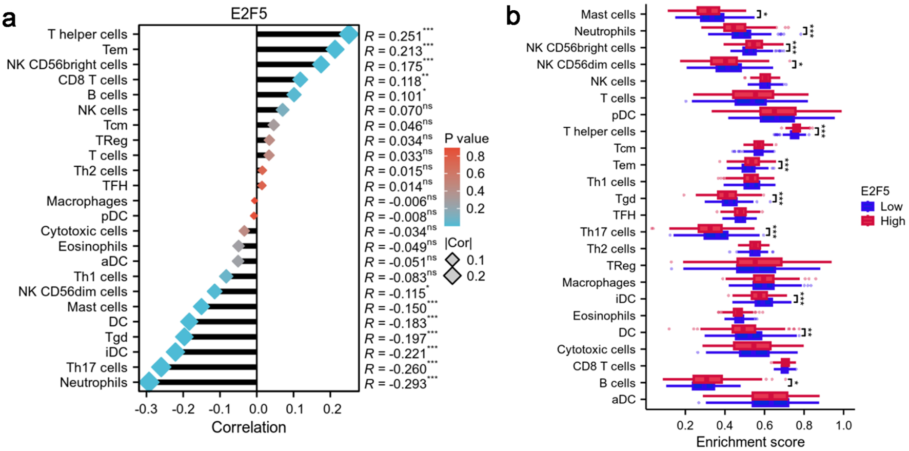Correlation analysis indicated that T-helper cells, effector memory T cells, and natural killer (NK) CD56bright cells exhibited the strongest positive correlations with E2F5 expression (R = 0.251, 0.213, and 0.175, respectively). Conversely, neutrophils, Th17 cells, and immature dendritic cells (DCs) showed significant negative correlations with E2F5 expression (R = -0.293, -0.260, and -0.221, respectively) (Fig. 7a). Comparison of immune cell enrichment scores between high and low E2F5 expression groups revealed significant differences in the immune microenvironment. In the high E2F5 expression group, T-helper cells, effector memory T cells, and NK CD56bright cells showed significantly higher enrichment compared to the low expression group, while neutrophils, Th17 cells, and immature DCs exhibited significantly lower enrichment in the high E2F5 expression group (Fig. 7b).