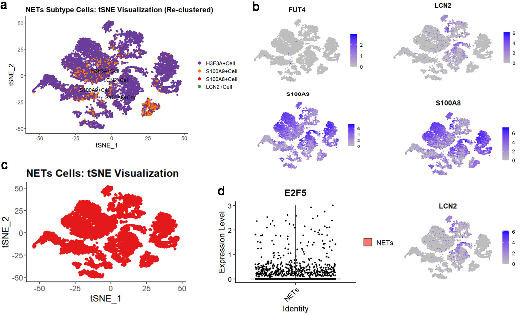 ![]() Click for large image | Figure 8. High expression of E2F5 in NETs in LSCC single-cell RNA sequencing. (a) tSNE subtype plot of NETs expression in LSCC. (b) Expression plot of NETs-related indicators. (c) Overall tSNE plot of NETs expression in LSCC. (d) Expression of E2F5 in NETs. LSCC: laryngeal squamous cell carcinoma; NETs: neutrophil extracellular traps. |