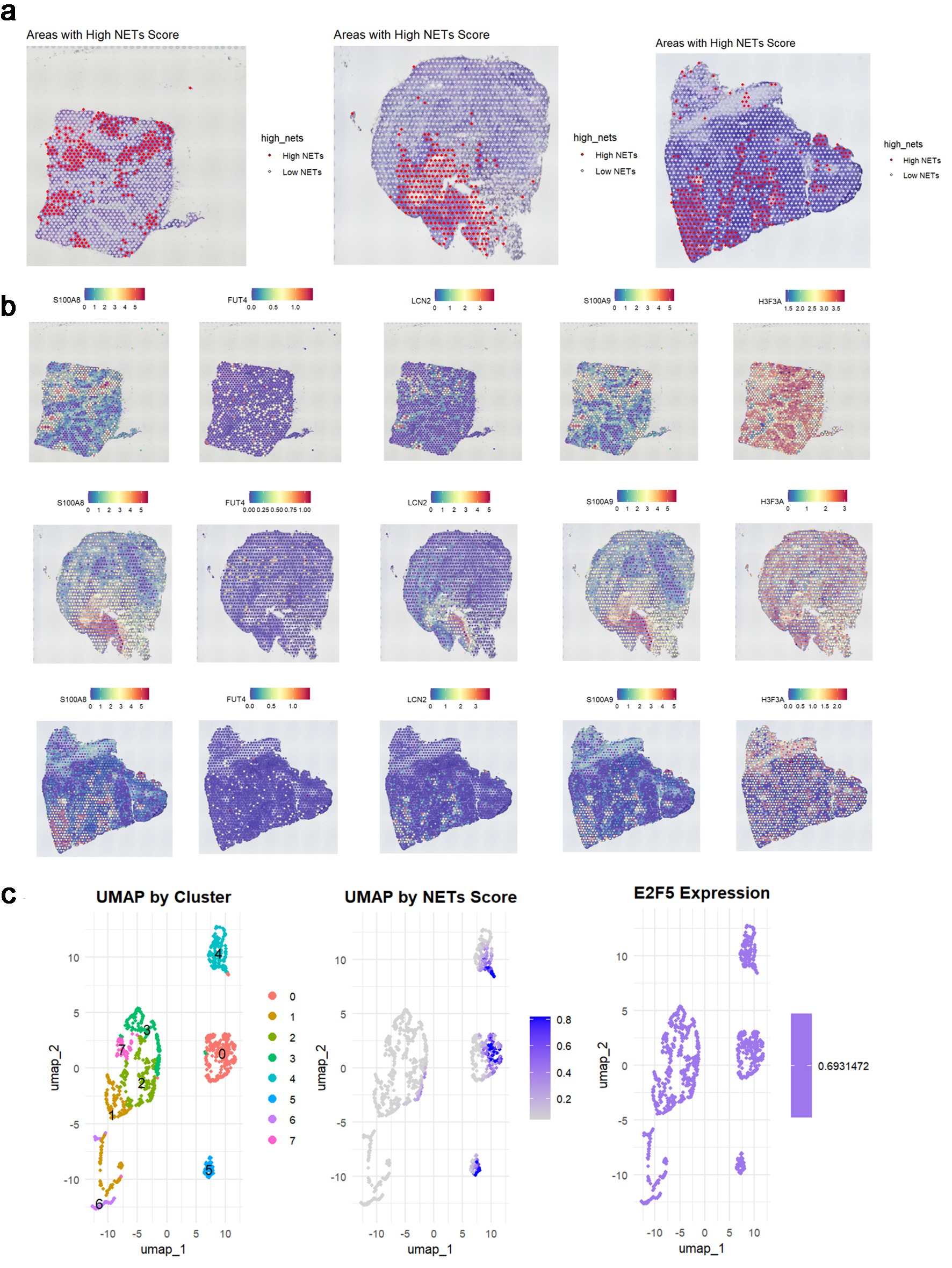 Based on the expression patterns of NETs-related markers (S100A8, FUT4, LCN2, S100A9, and HSP3A), NETs-related cell subpopulations were identified (Fig. 8a-c). Analysis revealed significant E2F5 enrichment in NETs high-expression cells (Fig. 8d). ST analysis showed widespread NETs distribution in tumor tissues (Fig. 9a), with NETs-related markers S100A8, FUT4, LCN2, S100A9, and HSP3A exhibiting high expression across tissue regions (Fig. 9b). Integration and dimensionality reduction of data from three tissue sections confirmed high E2F5 expression in NETs-enriched regions (Fig. 9c). Further ChIP-seq analysis revealed multiple binding peaks for E2F5, as a transcription factor, in the gene regions of S100A8, FUT4, LCN2, S100A9, and HSP3A (Fig. 10).