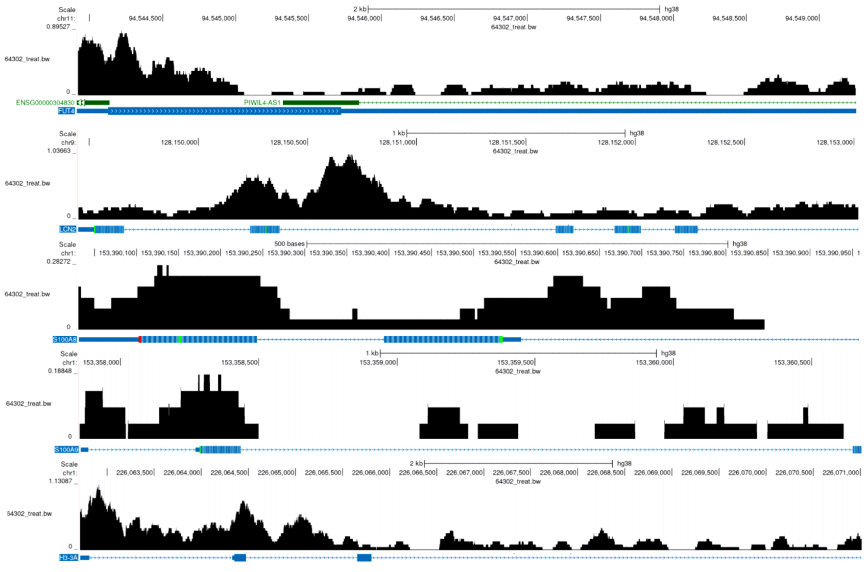 ![]() Click for large image | Figure 10. E2F5 transcription factor in NETs-related regions. The black histogram above represents sequencing read depth (64302_treat_bw), the middle colored bands indicate predicted functional elements, and the blue markers below show RefSeq predicted gene models. The gene regions of FUT4, LCN2, S100A8, S100A9, and H3-3A display multiple binding peaks. NETs: neutrophil extracellular traps. |