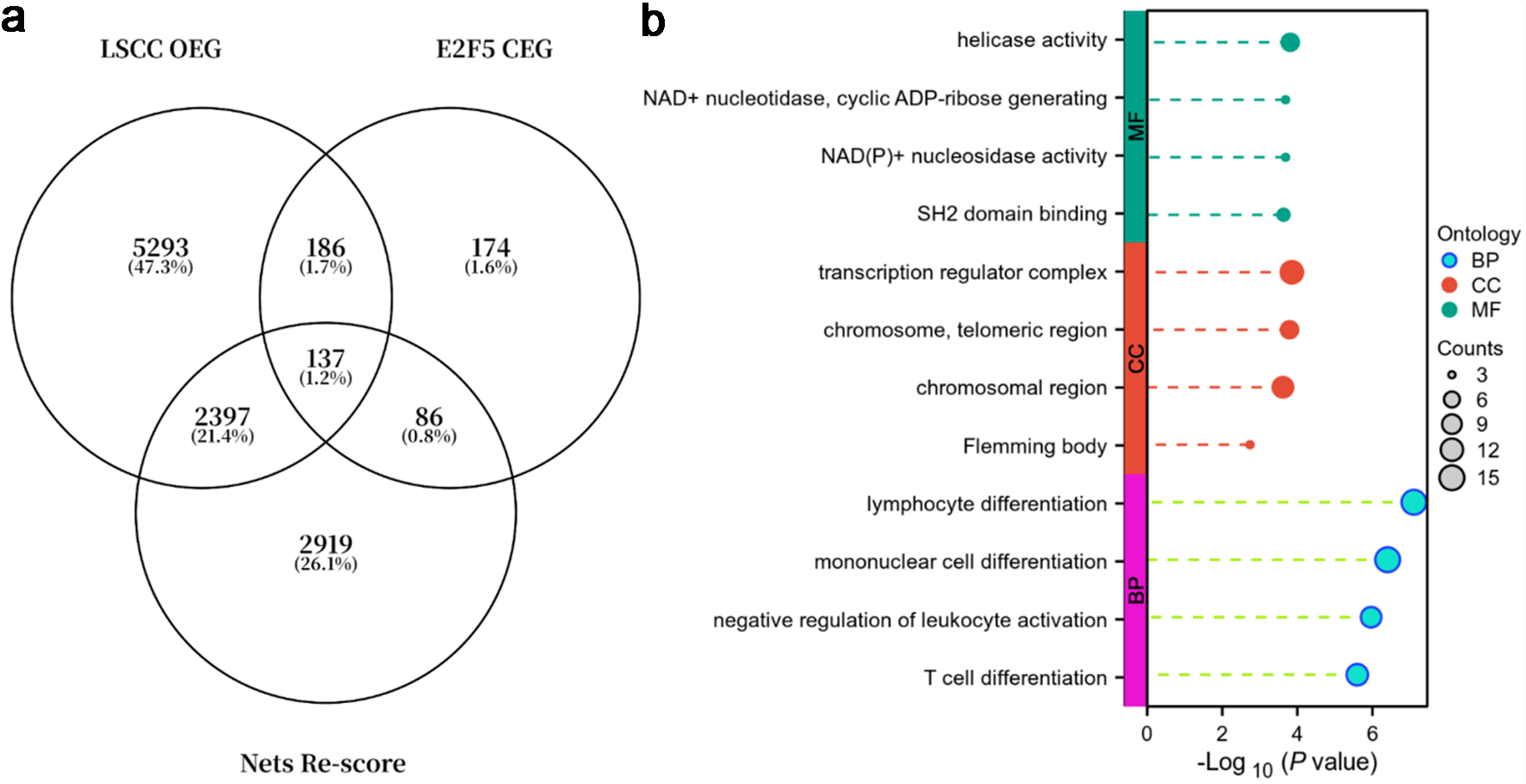 Additionally, analysis of E2F5 co-expressed genes, LSCC overexpressed genes, and genes with NETs-related scores > 1.5 (Fig. 11a) showed that these genes were primarily enriched in the following functional pathways: in biological process (BP), they were mainly involved in lymphocyte differentiation, monocyte differentiation, negative regulation of leukocyte activation, and T-cell differentiation; in cellular component (CC), they were primarily associated with transcriptional regulatory complexes, telomeric regions, chromosomal regions, and Flemming bodies; in molecular function (MF), they were mainly linked to helicase activity, NAD+ nucleosidase/ADP-ribose generation activity, NAD(P)+ nucleosidase activity, and SH2 domain binding (Fig. 11b).