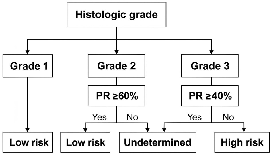 ![]() Click for large image | Figure 2. Proposed algorithm to predict Oncotype DX risk category using histologic grade and PR percentage. PR: progesterone receptor. |