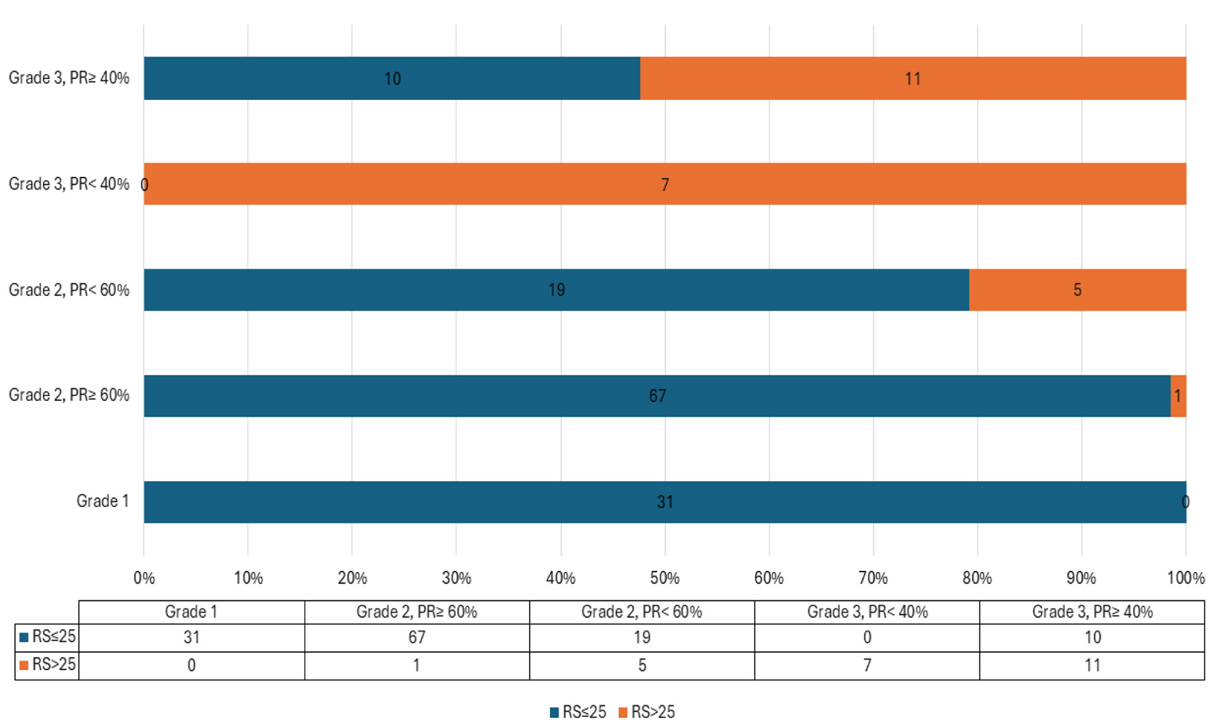 When we examined histologic grade in combination with PR percentage, we found a clear relationship with the RS (Table 3). All grade 1 had low RS regardless of the PR%, making them consistently low-risk.
