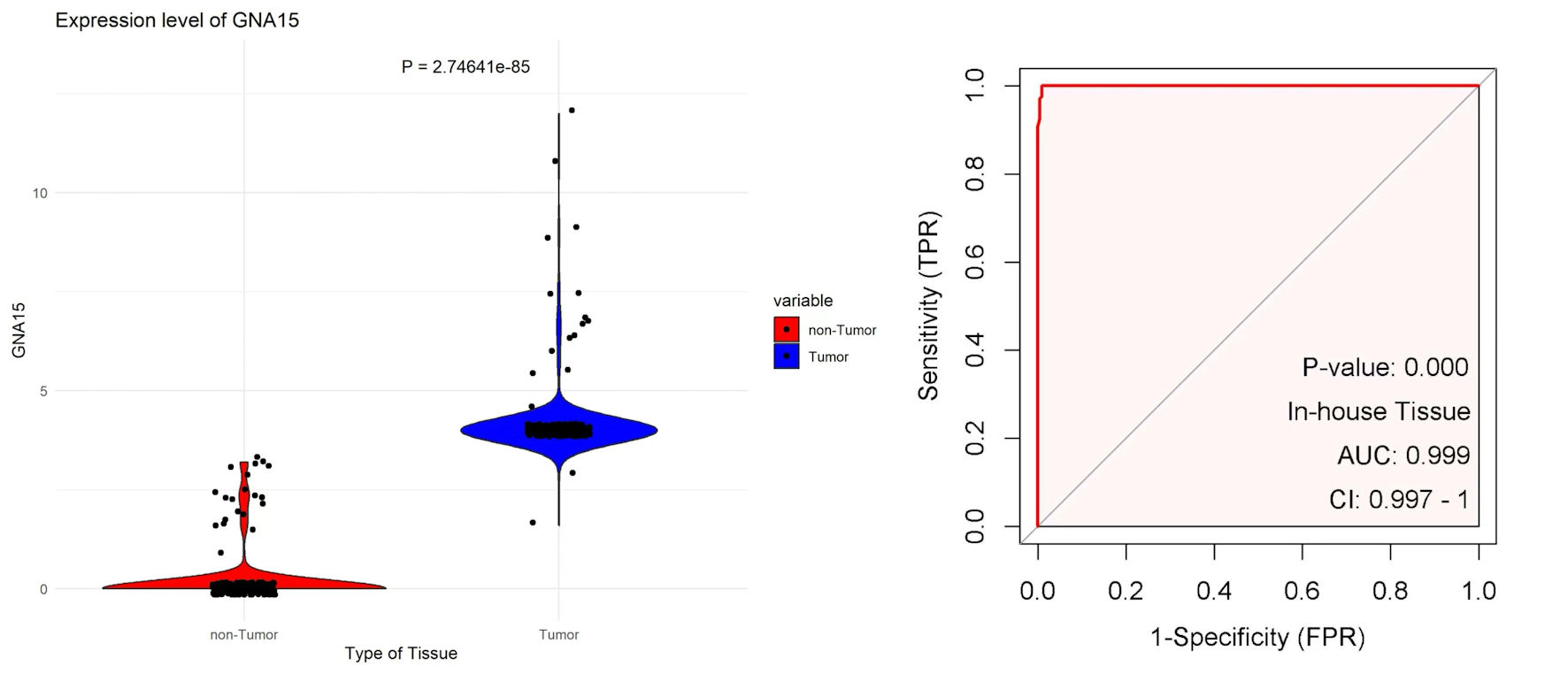 ![]() Click for large image | Figure 1. The left plot uses scatter-violin visualization to show that GNA15 expression is significantly higher in tumor (blue) than non-tumor (red) tissues. The right ROC curve, based on in-house tissue samples, shows that GNA15 has excellent diagnostic ability to distinguish tumor from non-tumor tissues. GNA15: G protein subunit α-15; ROC: receiver operating characteristic; AUC: area under the curve; FPR: false positive rate; CI: confidence interval; TPR: true positive rate. |