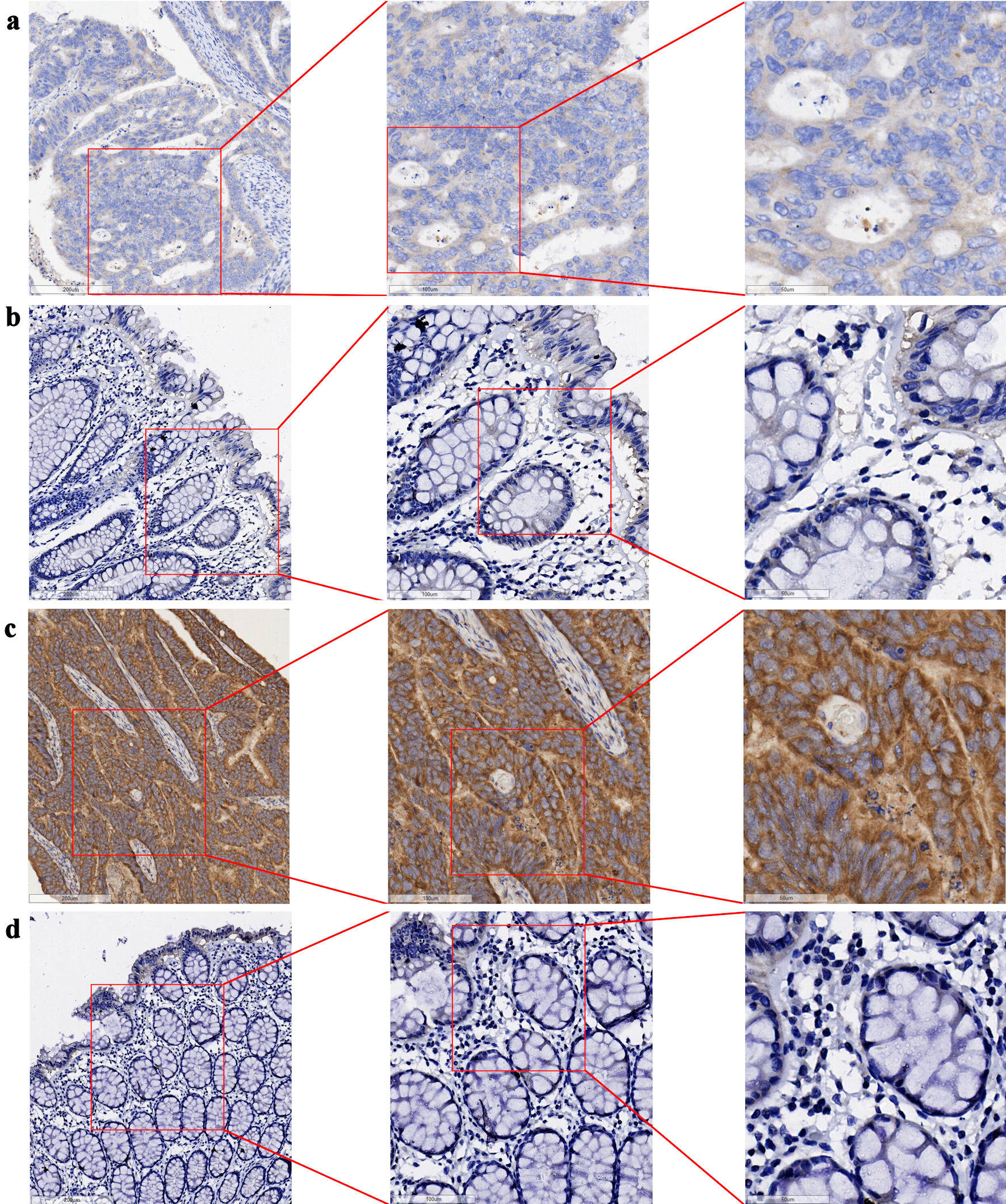 ![]() Click for large image | Figure 2. Expression of GNA15 protein in CRC tissues and their adjacent non-cancerous tissues (bar = 200 µm (left side of images), 100 µm (middle column), 50 µm (right side)). (a) CRC tissue (sample 1); (b) adjacent non-cancerous tissue (sample 1), with (a) and (b) derived from the same sample. (c) CRC tissue (sample 2); (d) adjacent non-cancerous tissue (sample 2), with (c) and (d) derived from the same sample. GNA15: G protein subunit α-15; CRC: colorectal cancer. |