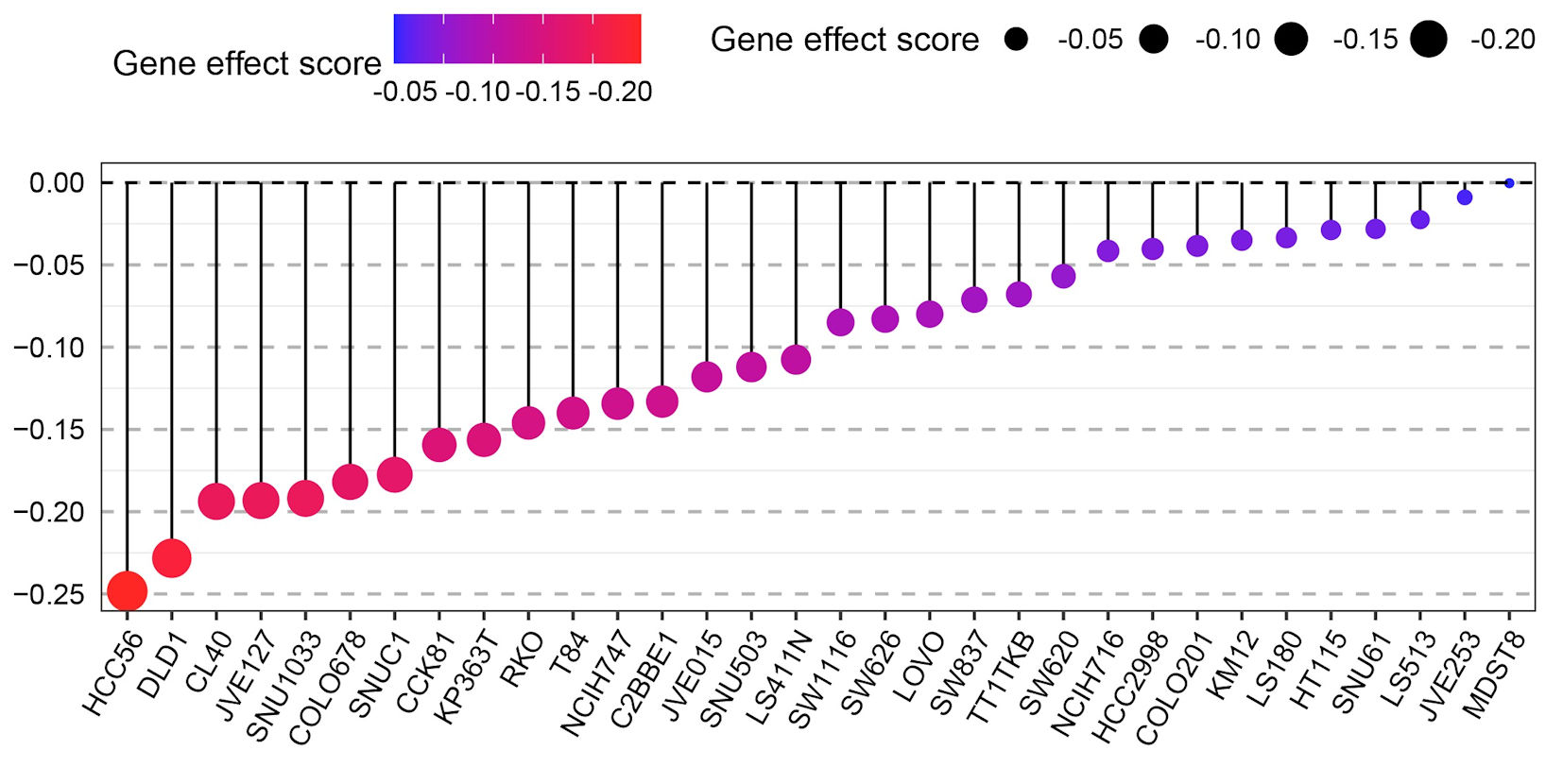 ![]() Click for large image | Figure 5. Dot plot showing the gene effect scores of different CRC cell lines (e.g., HCC56, DLD1, CL40, etc.) after GNA15 gene knockout via CRISPR-Cas9 technology. The color gradient (from blue to red) and the size of the black dots both represent the gene effect score: a more negative score (closer to -0.20, indicated by red and larger dots) means that knocking out GNA15 has a stronger inhibitory effect on the growth of that cell line, while a score near 0 (blue, small dots) means the cell line’s growth is barely affected. |
