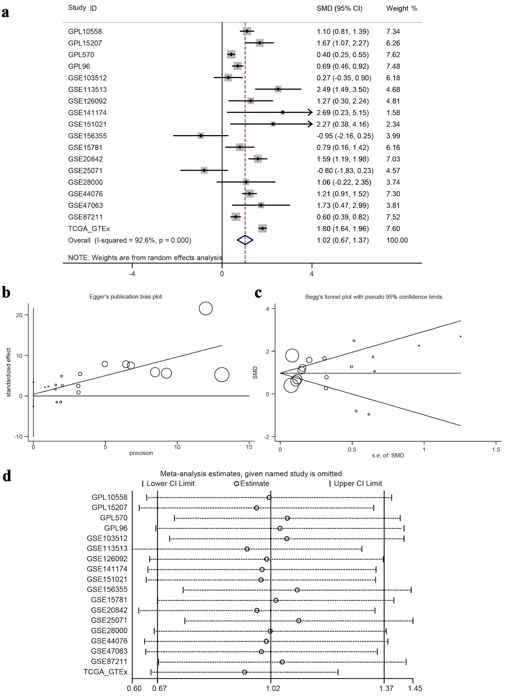 ![]() Click for large image | Figure 7. Meta-analysis and bias/sensitivity assessments. (a) A forest plot generated using inverse variance weighting is shown, where each study ID denotes a different dataset, and the diamond reflects the overall effect size with 95% CI, showing significant heterogeneity (I2 = 92.6%). (b) Egger’s publication bias plot, checking for the relationship between study precision and effect size to identify publication bias. (c) Begg’s funnel plot with pseudo 95% confidence limits, where symmetric distribution of study points around the mean effect suggests no significant publication bias. (d) A sensitivity analysis plot, displaying meta-analysis estimates when each study is excluded to test the robustness of the overall result. ID: identifier; GSE: Gene Set Enrichment; CRC: colorectal cancer; TCGA: The Cancer Genome Atlas; CI: confidence interval; SMD: standardized mean difference. |