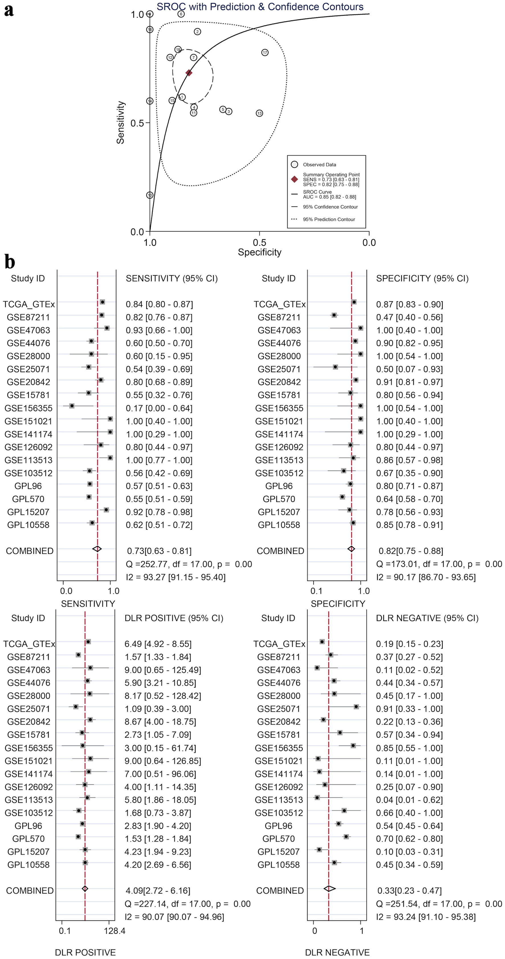 The calculated results showed that I2 = 92.6% (Fig. 7a), which shows significant heterogeneity, indicating that the difference in GNA15 expression was largely attributed to non-sampling error factors. The Egger’s and Begg’s tests also showed no significant publication bias. This indicates that the conclusion of high expression of GNA15 in tumor cells is reliable (Fig. 7b, c). Also, using the pROC package in R to build the ROC and calculate the SROC curve, the AUC was 0.85, indicating that the expression level of GNA15 could better distinguish between cancerous and non-cancerous tissues (Fig. 8a). Summarizing each dataset from the TCGA and GTEx databases, the meta-analysis estimates for each dataset were relatively close, with an average of 1.02 (Fig. 7d), and the combined of sensitivity 0.73, the combined of specificity 0.82, the combined of DLR positive 4.09, and the combined of DLR negative was 0.33. These findings also show that GNA15 has high value in diagnosing CRC (Fig. 8b).