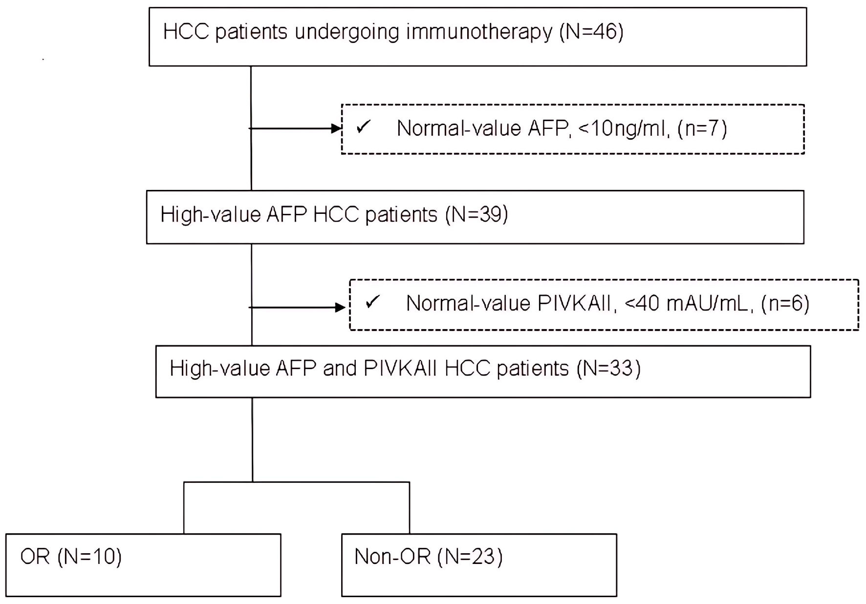 Methods: Data were collected from subjects with Child-Pugh class A, and Barcelona Clinic Liver Cancer (BCLC) stage B or C HCC, who received immunotherapy from September 2021 to June 2023. The exclusion criteria included cases with normal values of AFP or PIVKA-II. The values of AFP and PIVKA-II at baseline and 4 weeks after initiation of therapy were recorded. The clinical baseline characteristics, and therapeutic outcomes, including radiologic objective response (OR) and overall survival (OS) of enrolled patients were collected and further analyzed.