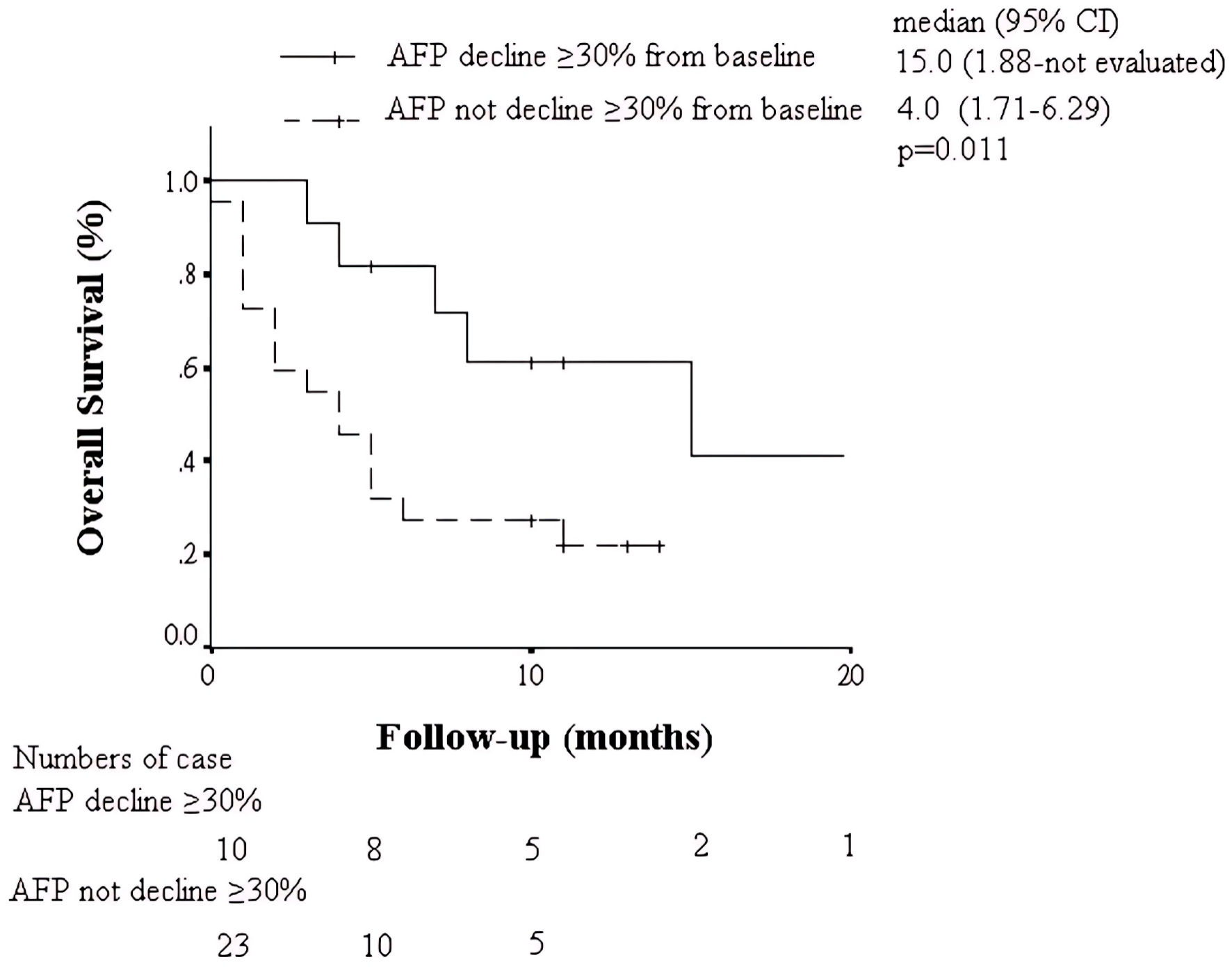 ![]() Click for large image | Figure 3. Kaplan-Meier analysis of overall survival in patients with AFP decline ≥ 30% or without. AFP: alpha-fetoprotein; CI: confidence interval. |
