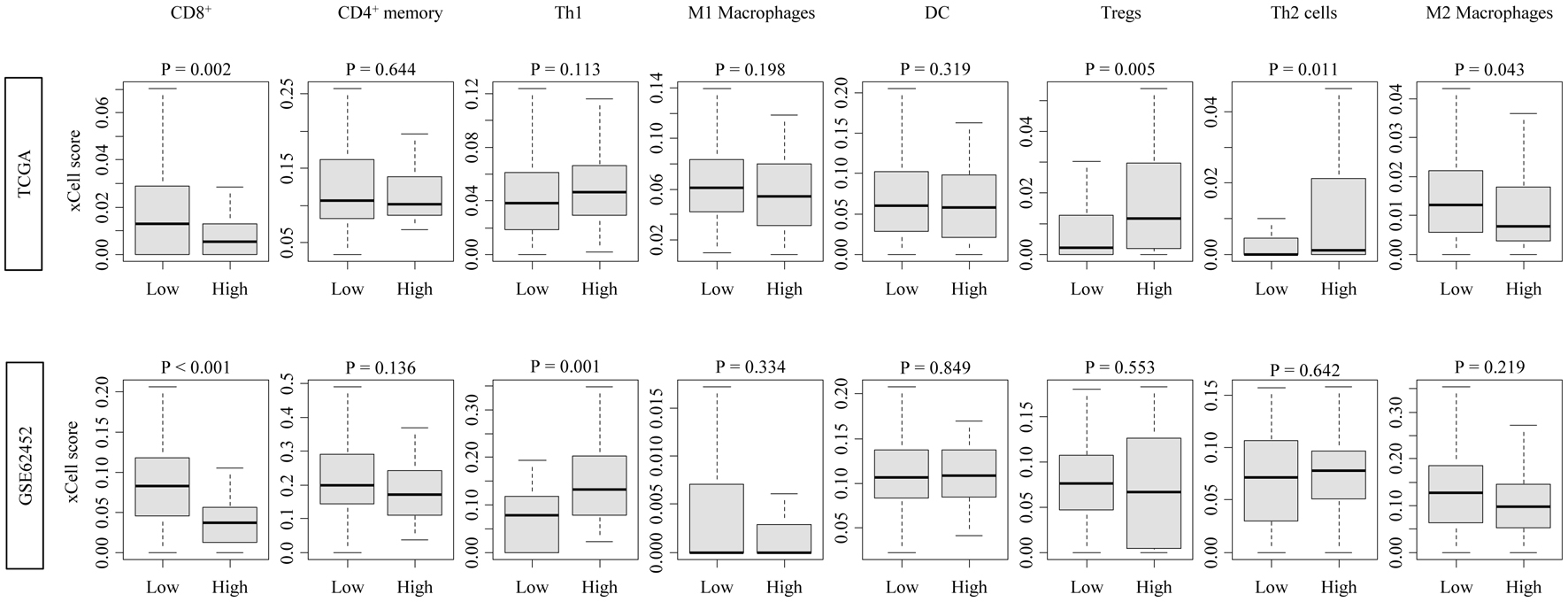 ![]() Click for large image | Figure 2. Immune cell infiltration profiles associated with CDCP1 expression in PDAC. Boxplots showing xCell-inferred infiltration scores of CD8+ T cells, CD4+ memory T cells, Th1 cells, Th2 cells, regulatory T cells (Tregs), dendritic cells (DCs), and M1/M2 macrophages in high CDCP1 and low CDCP1 groups in the TCGA and GSE62452 cohorts. |