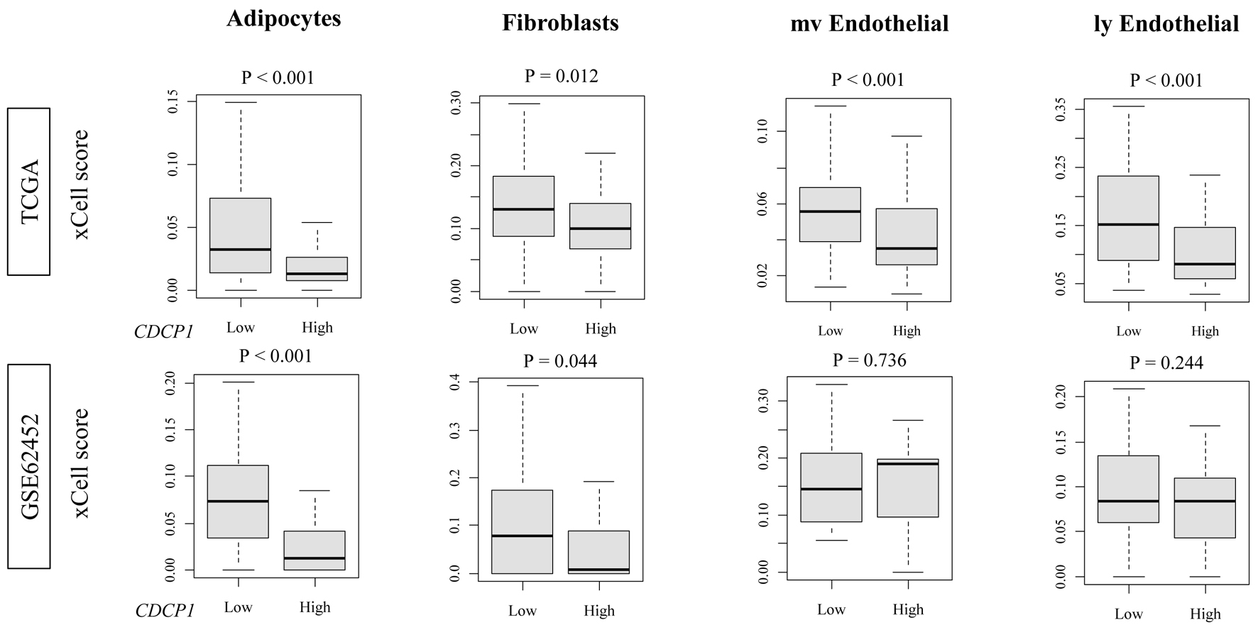High CDCP1 PDAC exhibited significantly decreased infiltration of adipocytes (TCGA and GSE62452: both P < 0.001) and fibroblasts (TCGA: P = 0.012; GSE62452: P = 0.044), as estimated by xCell. In contrast, no significant differences were observed in the abundance of endothelial cells or myofibroblasts (Fig. 3). These results suggest a selective depletion of stromal components, particularly lipid-rich and matrix-producing cell types, in the high CDCP1 PDAC TME.