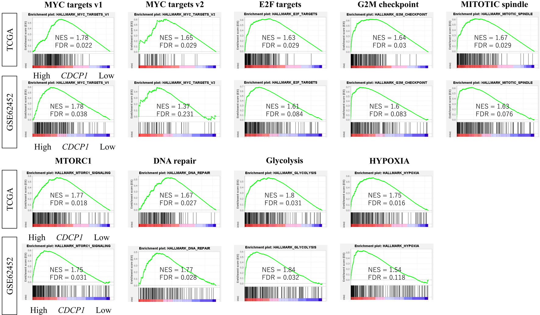 GSEA revealed that high CDCP1 tumors were significantly enriched for cell proliferation-related gene sets (E2F targets, G2M checkpoint, MYC targets v1/v2, and p53 pathway) as well as protumorigenic processes such as hypoxia, transforming growth factor-β (TGF-β) signaling, and glycolysis. These enrichments were consistently observed in both the TCGA and GSE62452 cohorts (FDR < 0.25; NES > 1.5) (Fig. 4).