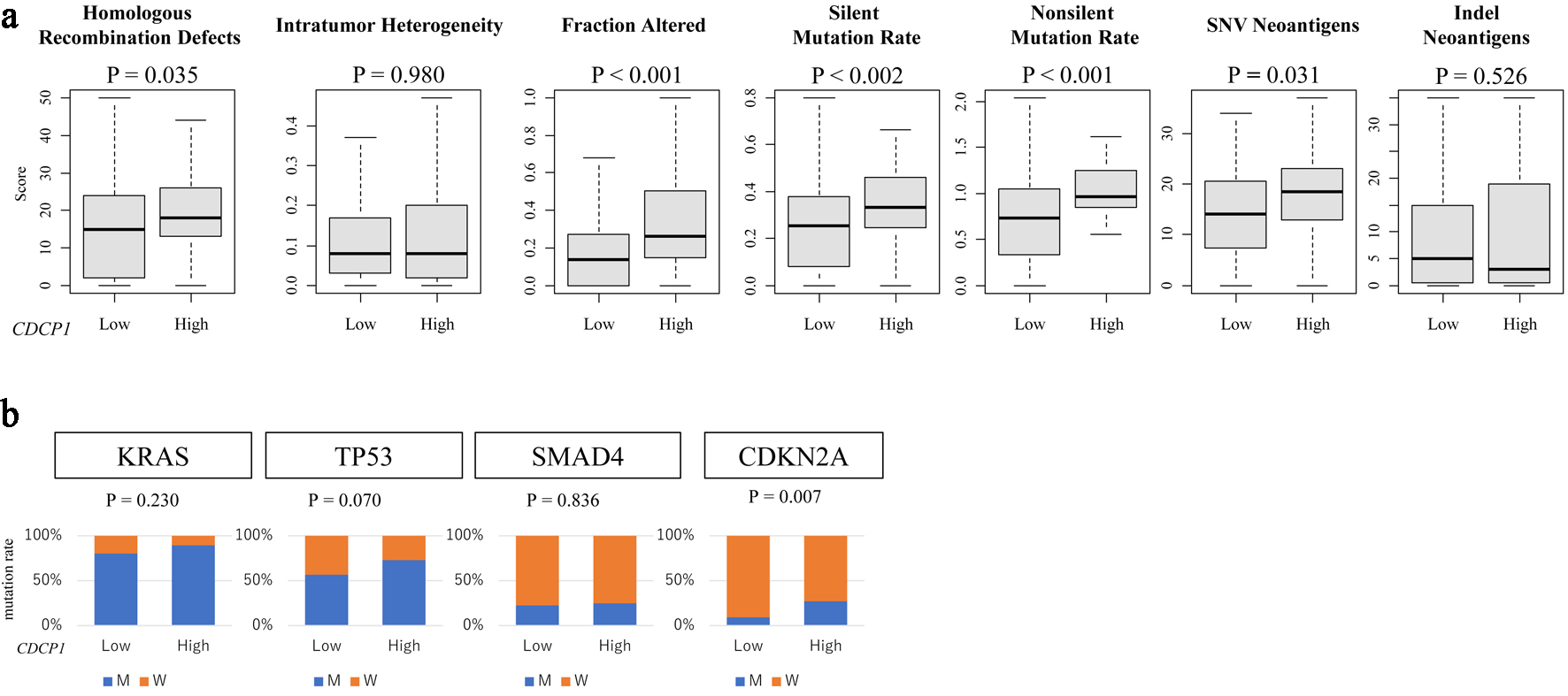 For the TCGA cohort, we further examined genomic instability features [15]. Mutation data were used to calculate silent and non-silent mutation rates, single nucleotide variant (SNV) burden, and insertion/deletion (indel) neoantigen loads. Homologous recombination deficiency (HRD) scores, intratumor heterogeneity scores, and fraction genome altered were obtained from previously published pan-cancer studies [16-19]. We assessed the association between CDCP1 expression and mutation status of canonical PDAC driver genes (KRAS, TP53, CDKN2A, and SMAD4).