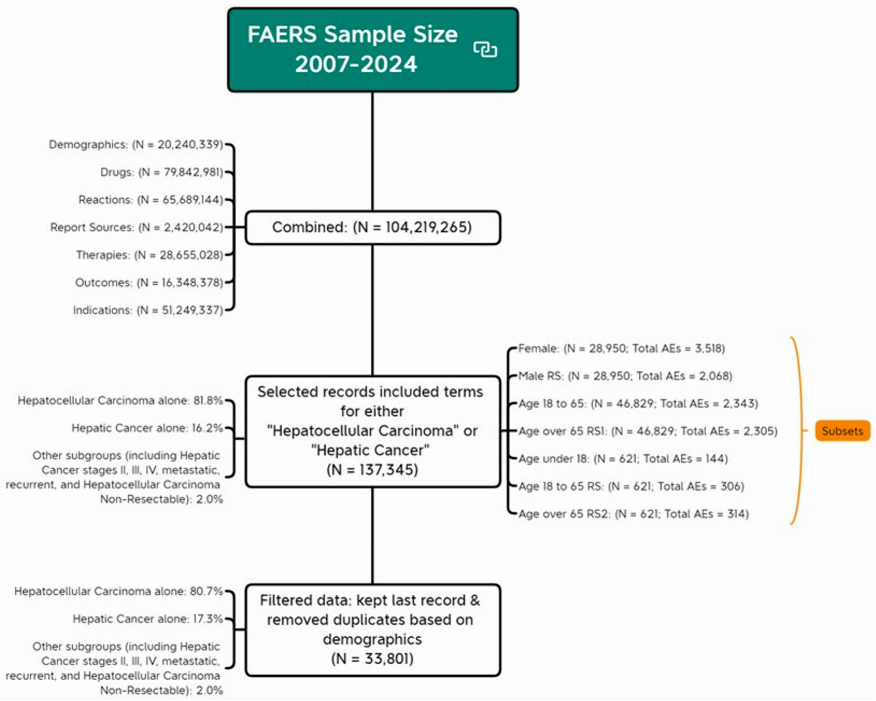 By merging the seven files (DEMO, DRUG, REAC, INDI, OUTC, RPSR, and THER), we compiled a substantial dataset with a total of 104,219,265 records. To obtain liver cancer targeted dataset, we selected records from “INDT_PT” variable in the indications for use file that included terms related to either “hepatocellular carcinoma” or “hepatic cancer”, resulting 137,345 records. For instance, records labeled “hepatocellular carcinoma non-resectable” were included because they contain the term “hepatocellular carcinoma”. Similarly, records related to hepatic cancer stages II, III, IV, metastatic, and recurrent were also included. HCC alone constituted 81.8% of our sample and hepatic cancer alone accounted for 16.2% of our sample.