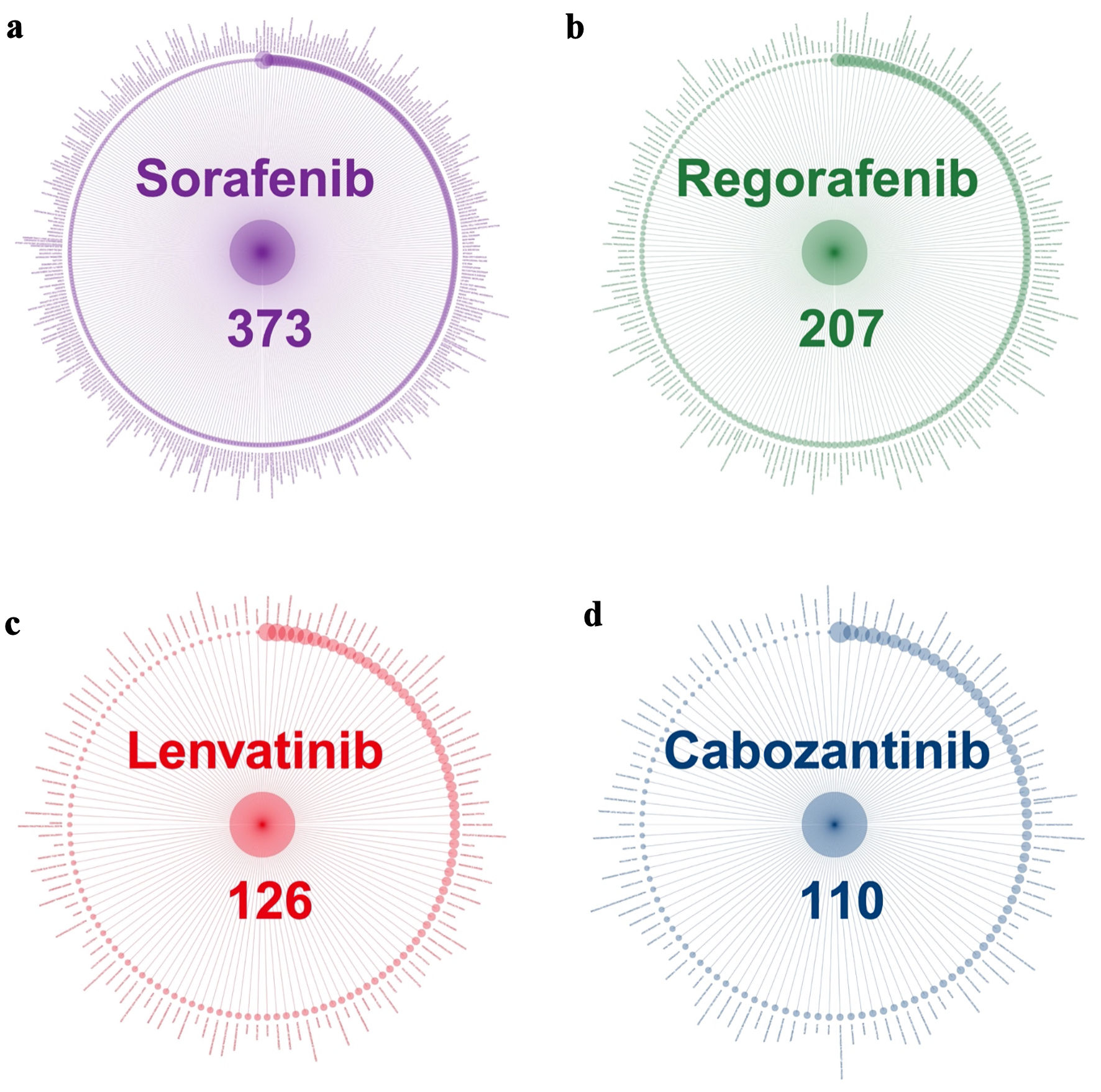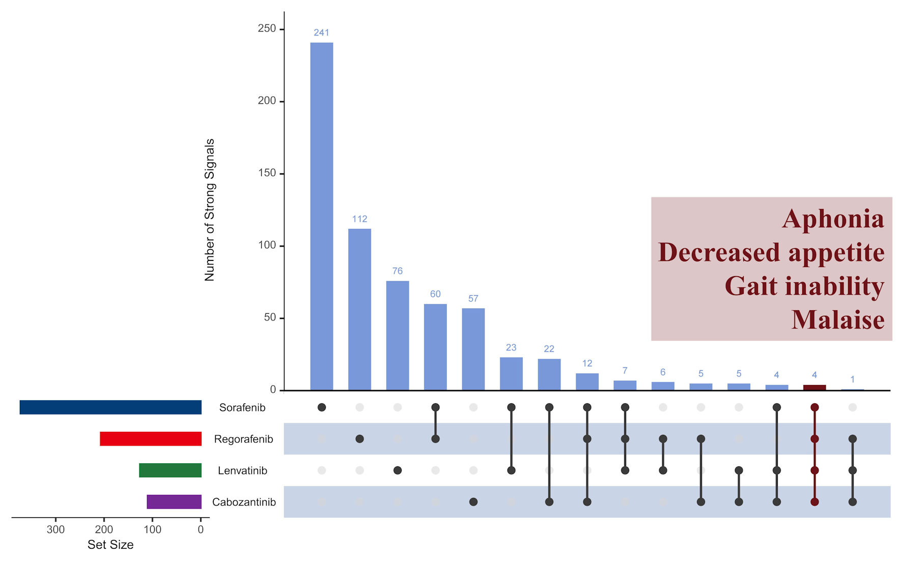 To highlight key strong signals, Figure 3 presents the top 50 strong signals for each medication, and the top three for each drug are noted here. For sorafenib, these included pharyngeal hemorrhage (OR = 204.8), increased globulins (OR = 74.2), and extravasation blood (OR = 57.9); for regorafenib, retinal artery occlusion (OR = 73.5), hemorrhage urinary tract (OR = 69.0), and nasal obstruction (OR = 63.6); for lenvatinib, intracranial aneurysm (OR = 76.7), food intolerance (OR = 74.3), and increased blood calcium (OR = 58.1); for cabozantinib, mood swings (OR = 104.5), decreased tumor marker (OR = 48.9), and varicose ulceration (OR = 48.8).