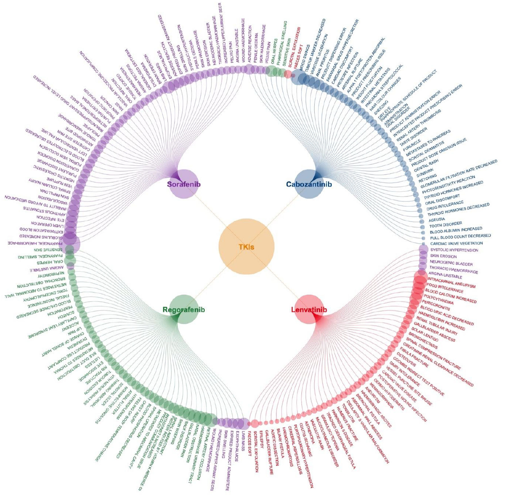 Moreover, while a big number of 816 signals were identified for the four TKI medications, the overlap among them was limited, with only about 20% of signals appearing in two or more drugs. We also identified 32 signals that indicate a 100% likelihood of death or life-threatening outcomes, but no identical signals were found across all four drugs. This finding aligns with previous studies that reported frequent occurrences of severe AEs in patients treated with TKIs [9-13]. However, our results find that the specific AEs associated with different TKIs vary considerably, which contrasts with earlier research. Previous studies had reported that the most common AEs including fatigue, diarrhea, HFSR, nausea, vomiting, decreased appetite, hypertension, and weight loss, were generally similar across the four TKI medications [9]. Other studies have also consistently reported these common AEs in TKI medications for liver cancer treatment [22-26]. One possible reason is that previous clinical trials often focused on relatively short-term effects, while our study includes data starting from the first TKI on the market, capturing potential long-term effects from years of TKI use. For example, Schwartz et al reported that in treating HCC with cabozantinib, the median time to the first occurrence of an AE ranged from 0 to 16 weeks, with hypertension occurring as early as 2 weeks and fistulas as late as 14 weeks [22]. As a result, similar AEs reported across different TKI medications might suggest similar strategies for managing side effects.