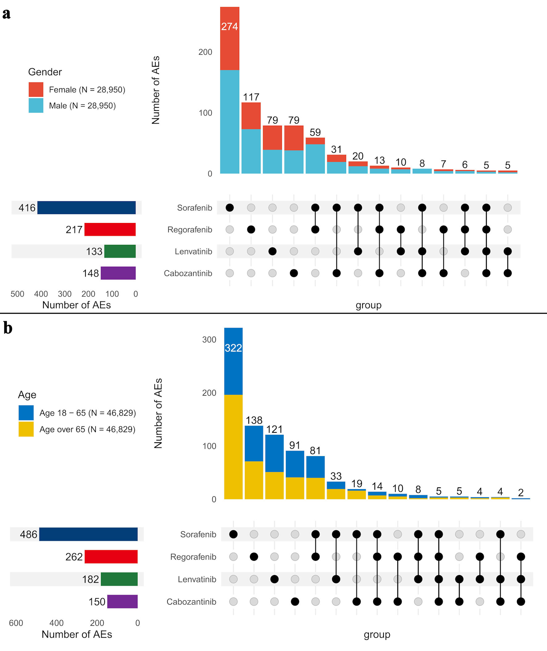 ![]() Click for large image | Figure 5. Comparison of strong signals of adverse events across four TKI medications by gender (a) and age groups (b). AE: adverse event. |