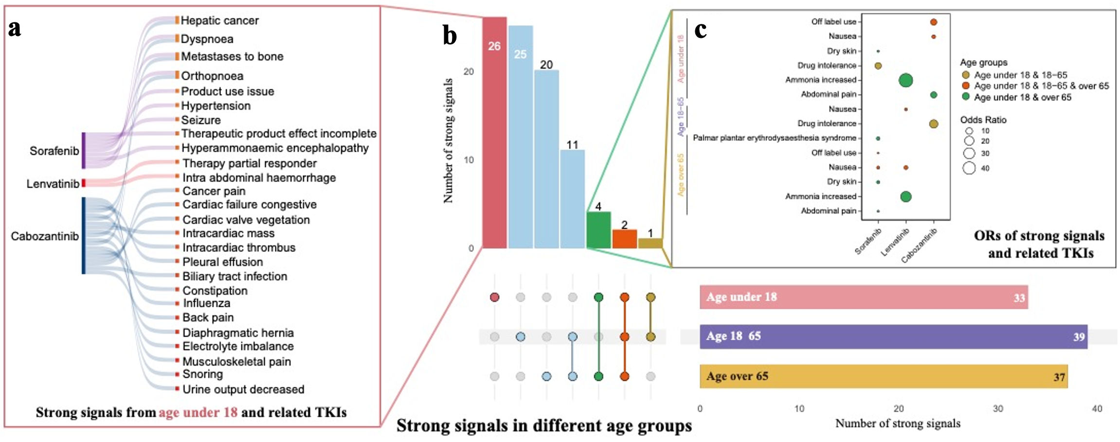 To specifically investigate strong signals in individuals under 18, we presented the strong signals identified across the four medications for the age groups under 18, 18 - 65, and over 65 (Fig. 6a-c). For sorafenib, palmar-plantar erythrodysesthesia syndrome was reported in all age groups. However, 11 additional strong signals, such as food intolerance, respiratory issues, seizures, bone displacement, and high oxygen saturation, were exclusive to participants under 18. Regorafenib showed no AE signals in the under 18 group, while some AEs were reported in adults and seniors. Lenvatinib was associated with appetite loss across all age groups, with three additional AEs - high blood calcium levels, therapy area involvement, and abdominal hemorrhage - reported only in the under 18 group. Adults and seniors shared fatigue and asthenia as common AEs. Similarly, cabozantinib also showed appetite loss across all age groups, with 20 additional AEs reported only in participants under 18, including pain, bone displacement, heart issues, and fluid accumulation. These findings highlight distinct AE patterns across age groups for each TKI.