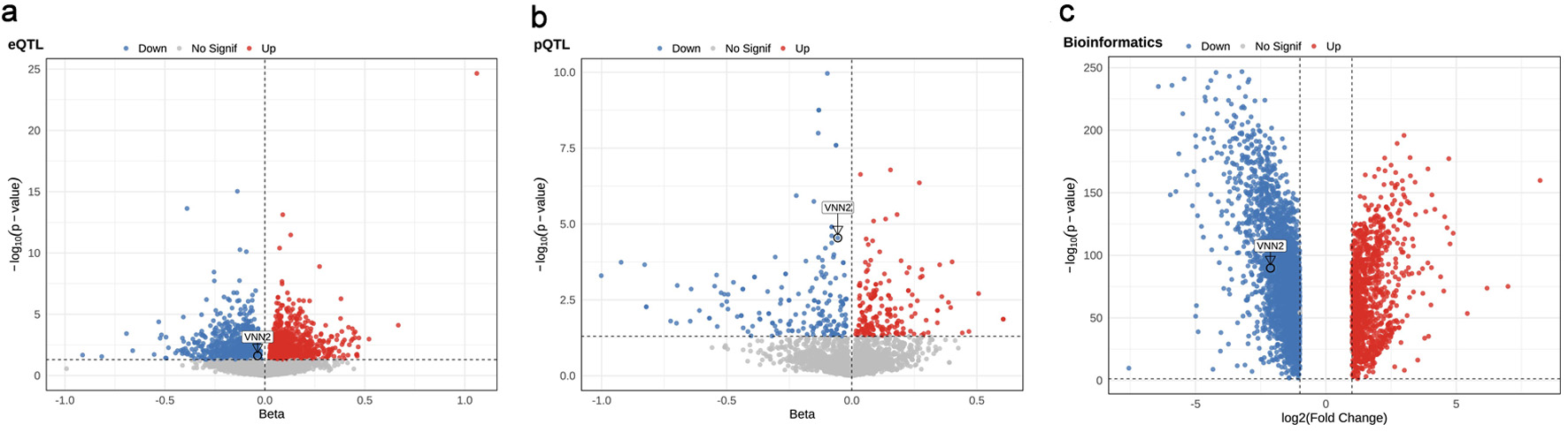 Results: Bulk-level MR analysis showed that genetically predicted increases in VNN2 expression and protein levels were significantly associated with a reduced risk of LUAD (eQTL-MR: odds ratio (OR) = 0.964, 95% confidence interval (95% CI), 0.934–0.995; P = 0.024; pQTL-MR: OR = 0.946, 95% CI, 0.921–0.970; P = 2.87 × 10−5). Transcriptomic analyses confirmed significant downregulation of VNN2 in LUAD tumors compared with normal lung tissues. sc-eQTL MR identified the strongest association in resting natural killer (rNK) cells (OR = 0.896, 95% CI, 0.829–0.967; P = 0.005).