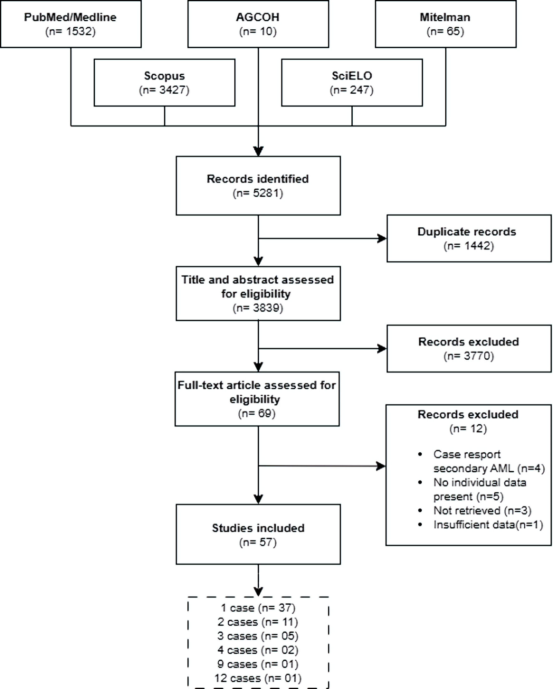 We retrieved 5,281 articles from electronic databases. After eliminating duplicates, we evaluated 3,839 articles by their titles and abstracts. Afterward, we excluded 3,770 articles that did not meet the eligibility criteria. We reviewed the remaining 69 full-text articles and included 57 that met the selection criteria (Fig. 1). The selected articles were published between 1990 and 2023 (Fig. 2; Supplementary Material 2, wjon.elmerpub.com). The majority of these (n = 37, 64.9%) reported a single case of AML with t(16;21), for a total of 103 cases.