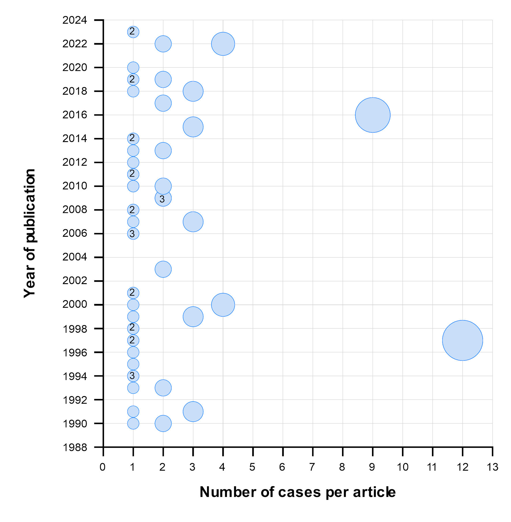 ![]() Click for large image | Figure 2. Number of cases reported in each article according to year of publication. Circles without numbers indicate that only one article was published in that year, whereas numbers within circles indicate the number of articles (more than one) published in that year. The size of each circle represents the number of cases reported per article. |