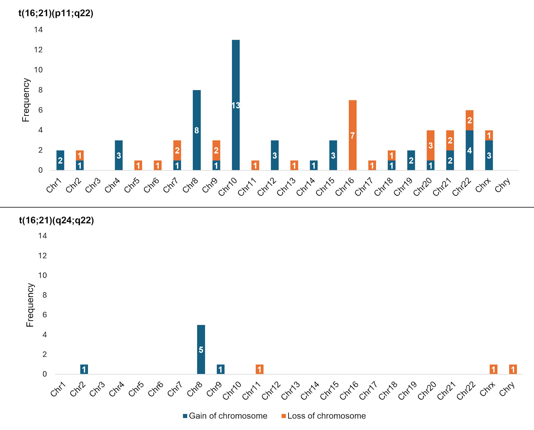 ![]() Click for large image | Figure 3. Frequency of numerical chromosomal alterations among cases with AML with t(16;21) according to chromosomal breakpoints. AML: acute myeloid leukemia; t(16;21): translocation between chromosomes 16 and 21; Chr: chromosome. |