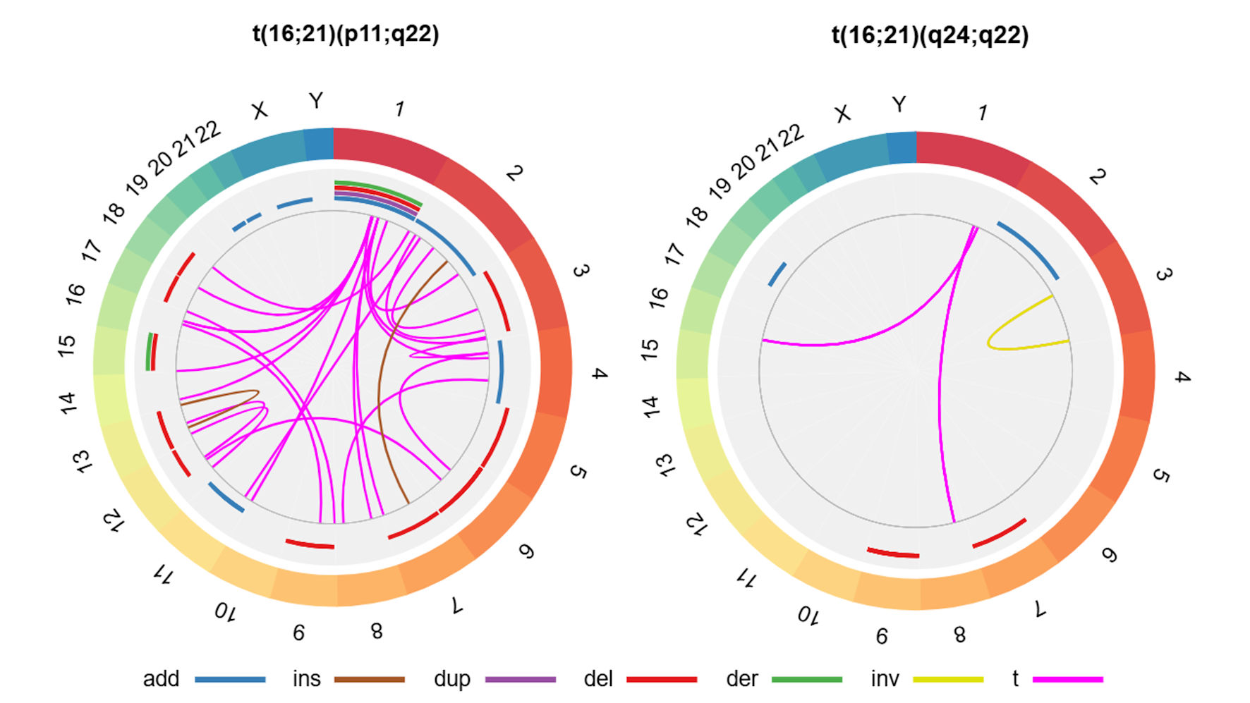 ![]() Click for large image | Figure 4. Secondary structural chromosomal alterations in cases with AML with t(16;21) according to chromosomal breakpoints. In the external ring, the chromosomes are individually colored and arranged in clockwise order from chromosome 1 to chromosome Y. In the other rings, chromosomal abnormalities are presented; given that we do not have specific information on the affected chromosomal regions, we present the data as the entire chromosome affected. The sole case with AML with t(16;21)(q21;p21) presented add(17)(q22) and t(1;3)(q24;p24), whereas the case with AML with t(16;21)(p11;q13) showed no secondary abnormalities. The affected arms, regions and bands are shown here (Supplementary Material 3, wjon.elmerpub.com). add: chromosomal addition; ins: insertion; dup: duplication; del: deletion; der: derivative; inv: inversion; t: translocation; AML: acute myeloid leukemia; t(16;21): translocation between chromosomes 16 and 21. |
