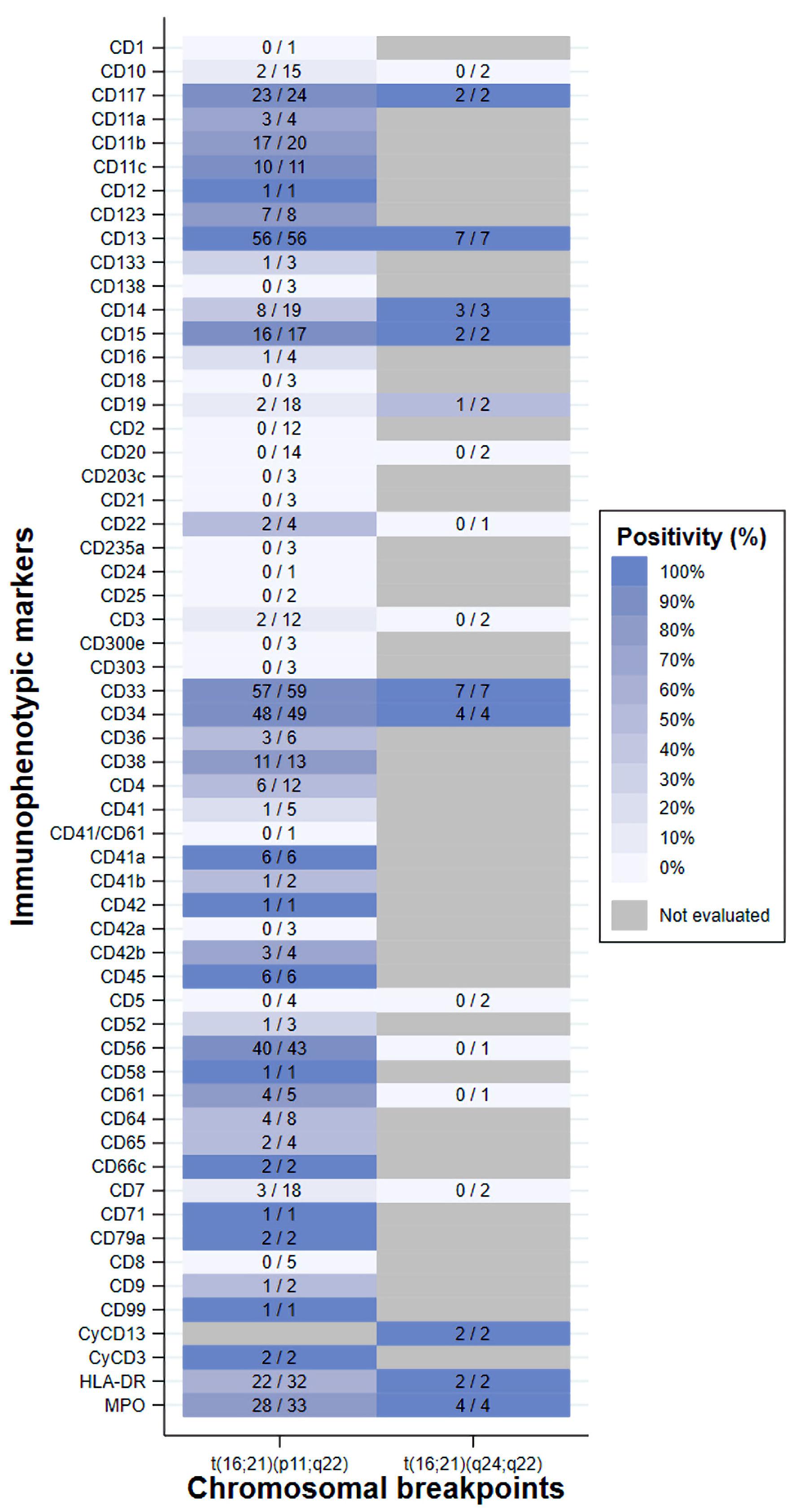 Additionally, the expression of immunophenotypic markers was not uniformly evaluated among the studies. Among the 103 cases, the most frequently evaluated markers were CD33 (n = 66, 64.1%), CD13 (n = 63, 61.2%), CD34 (n = 53, 51.5%), CD56 (n = 44, 42.7%) and myeloperoxidase (MPO) (n = 37, 35.9%). Percentages were calculated as the proportion of cases in which each marker was evaluated relative to the total number of cases. In the t(16;21)(p11;q22) group, the most frequent positive immunophenotypic markers (among the cases evaluated) were CD33 (57/59, 96.6%), CD13 (56/56, 100%), CD34 (48/49, 98.0%), CD56 (40/43, 93.0%) and MPO (28/33, 84.8%). Percentages were calculated as the proportion of marker-positive cases relative to the total number of cases evaluated for each marker. In the t(16;21)(q24;q22) group, the expression of the markers CD13 (7/7), CD33 (7/7), CD34 (4/4) and MPO (4/4) was positive in all cases evaluated (Fig. 5).