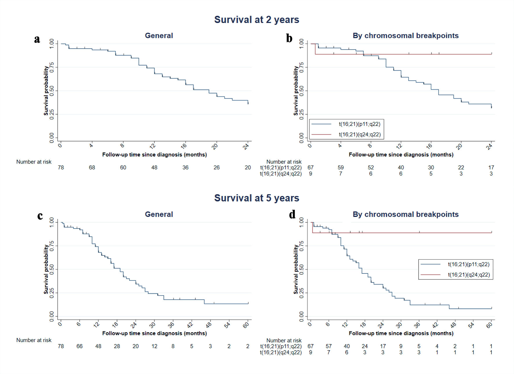 ![]() Click for large image | Figure 6. Kaplan–Meier graph of survival at 2 and 5 years in cases with AML with t(16;21). Of the 103 cases, 78 had survival information available. (a, c) Overall survival at 2 and 5 years; this includes the case with t(16;21)(q21;p21), with a follow-up time of 14 months, and the case with t(16;21)(p11;q13), who died at 22 months. (b, d) Curves stratified by translocation subtype. AML: acute myeloid leukemia; t(16;21): translocation between chromosomes 16 and 21. |