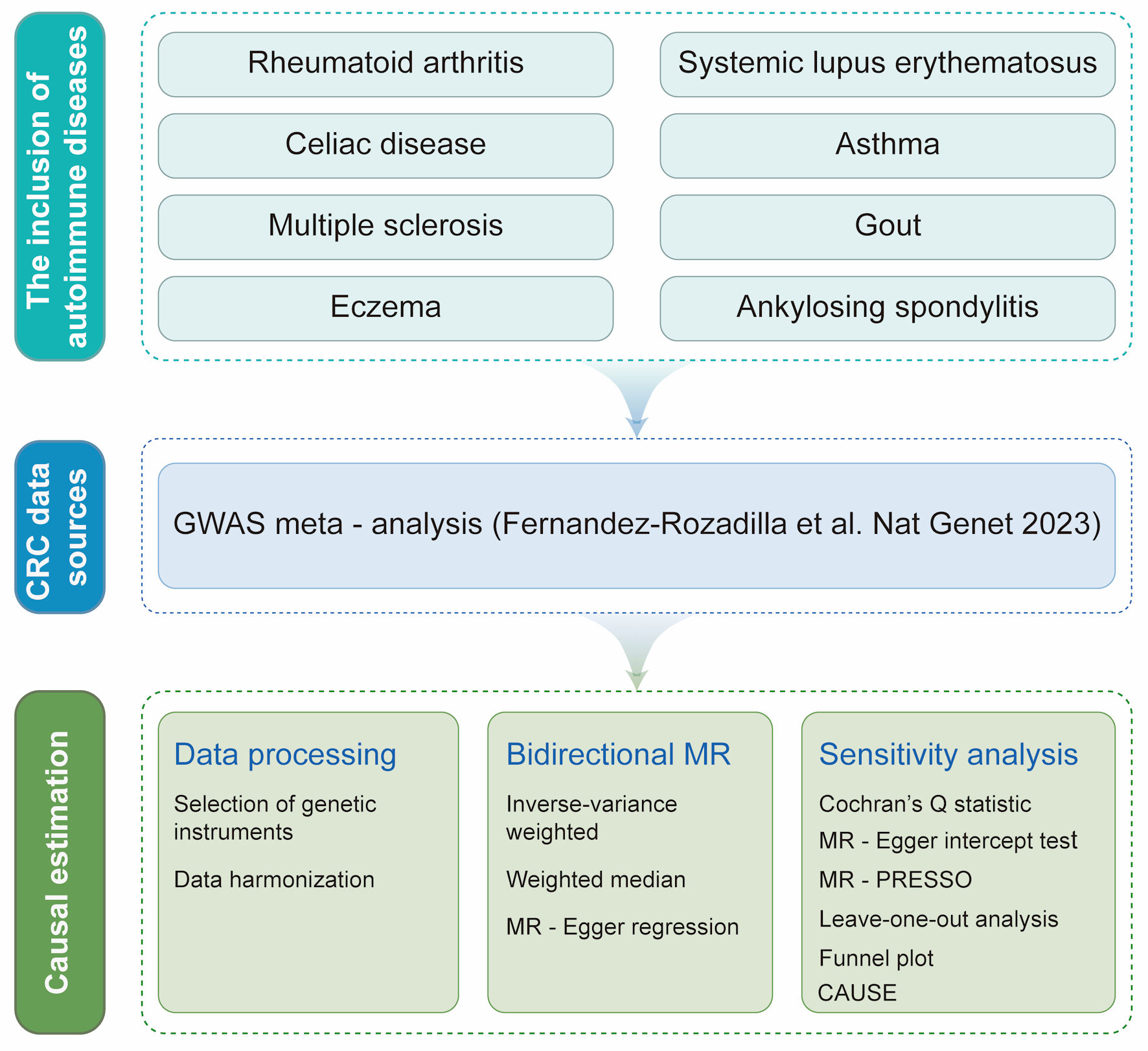 IrAEs: immune-related adverse events; AIDs: autoimmune diseases; CRC: colorectal cancer; MR: Mendelian randomization; IBD: inflammatory bowel disease; MS: multiple sclerosis; RA: rheumatoid arthritis; SLE: systemic lupus erythematosus; AS: ankylosing spondylitis; CD: celiac disease; GWAS: genome-wide association studies; IV: instrumental variable; SNP: single nucleotide polymorphism; EAF: effect allele frequency; BMI: body mass index; WM: weighted median; IVW: inverse-variance weighted; CAUSE: Causal Analysis Using Summary Effect Estimates; LOO: leave-one-out; GFD: gluten-free diet