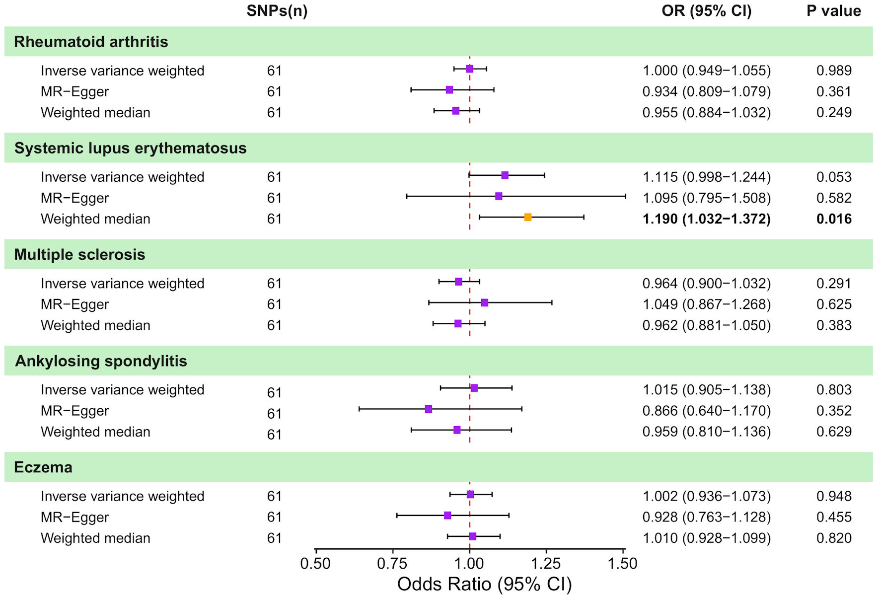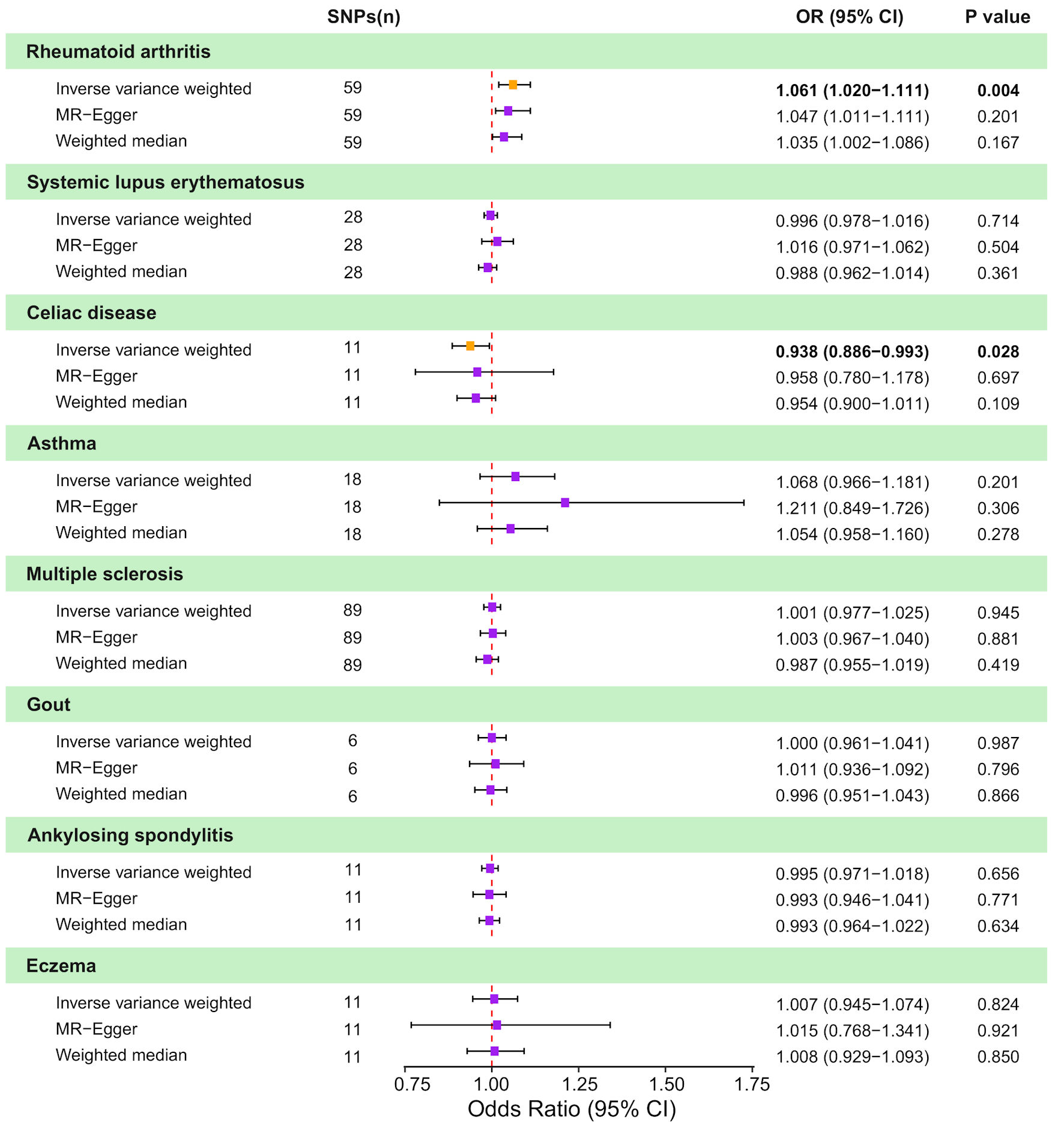 Following quality control and SNP filtering, 59 independent SNPs were identified as IVs for RA. Similarly, 44, 12, 18, 95, 7, 11, 12, and 64 SNPs were selected as IVs for SLE, CD, asthma, MS, gout, AS, eczema, and CRC, respectively. All SNPs exhibited F-statistics > 100, confirming their strength as IVs and minimizing potential weak instrument bias.