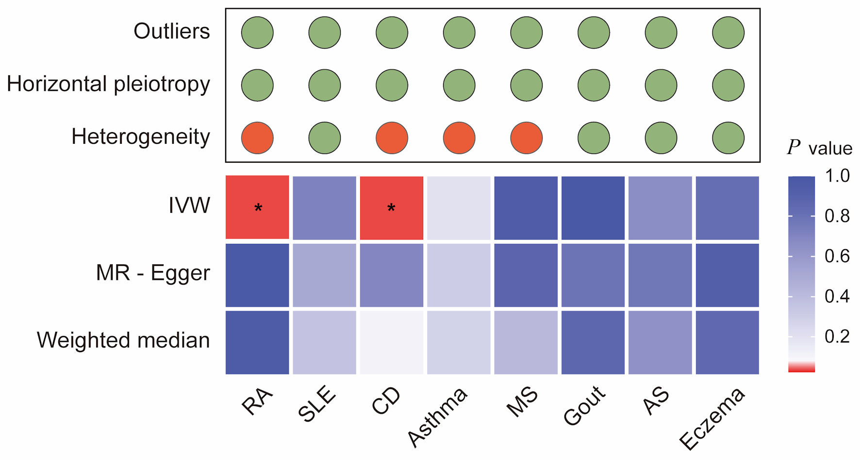 ![]() Click for large image | Figure 3. Integrated summary of Mendelian randomization (MR) estimates and sensitivity analyses for autoimmune diseases and colorectal cancer. The heatmap shows the strength of evidence from three MR methods (IVW, MR-Egger, and weighted median) for testing whether genetic susceptibility to eight autoimmune diseases (RA, SLE, CD, asthma, MS, gout, AS, and eczema) is causally related to colorectal cancer (CRC). The red boxes indicate the existence of a statistically significant causal relationship, whereas the blue boxes represent a lack of evidence for a causal relationship. The upper panel summarizes the results of sensitivity analyses, with green circles indicating no evidence and red circles indicating the presence of outliers, horizontal pleiotropy, or heterogeneity. *P value < 0.05. RA: rheumatoid arthritis; SLE: systemic lupus erythematosus; AS: ankylosing spondylitis; CD: celiac disease; IVW: inverse-variance weighted. |